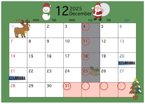 今月も木曜日が定休日ですが〜年末は30日の夕方から休まさせていただき、年始は1月3日までお正月休みとなります。